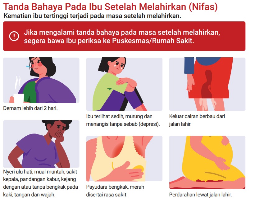 Tanda-tanda bahaya pada ibu setelah melahirkan (nifas) termasuk demam, perubahan suasana hati yang ekstrem, keluar cairan berbau, gejala preeklampsia atau eklampsia, kejang, infeksi payudara, dan perdarahan berlebihan. Jika ibu mengalami salah satu atau lebih dari gejala-gejala ini, sangat penting untuk segera mendapatkan perawatan medis untuk mencegah komplikasi lebih lanjut. Dengan pemantauan yang tepat dan penanganan medis yang cepat, ibu dapat pulih dengan baik setelah melahirkan dan kembali merawat bayi dengan sehat.